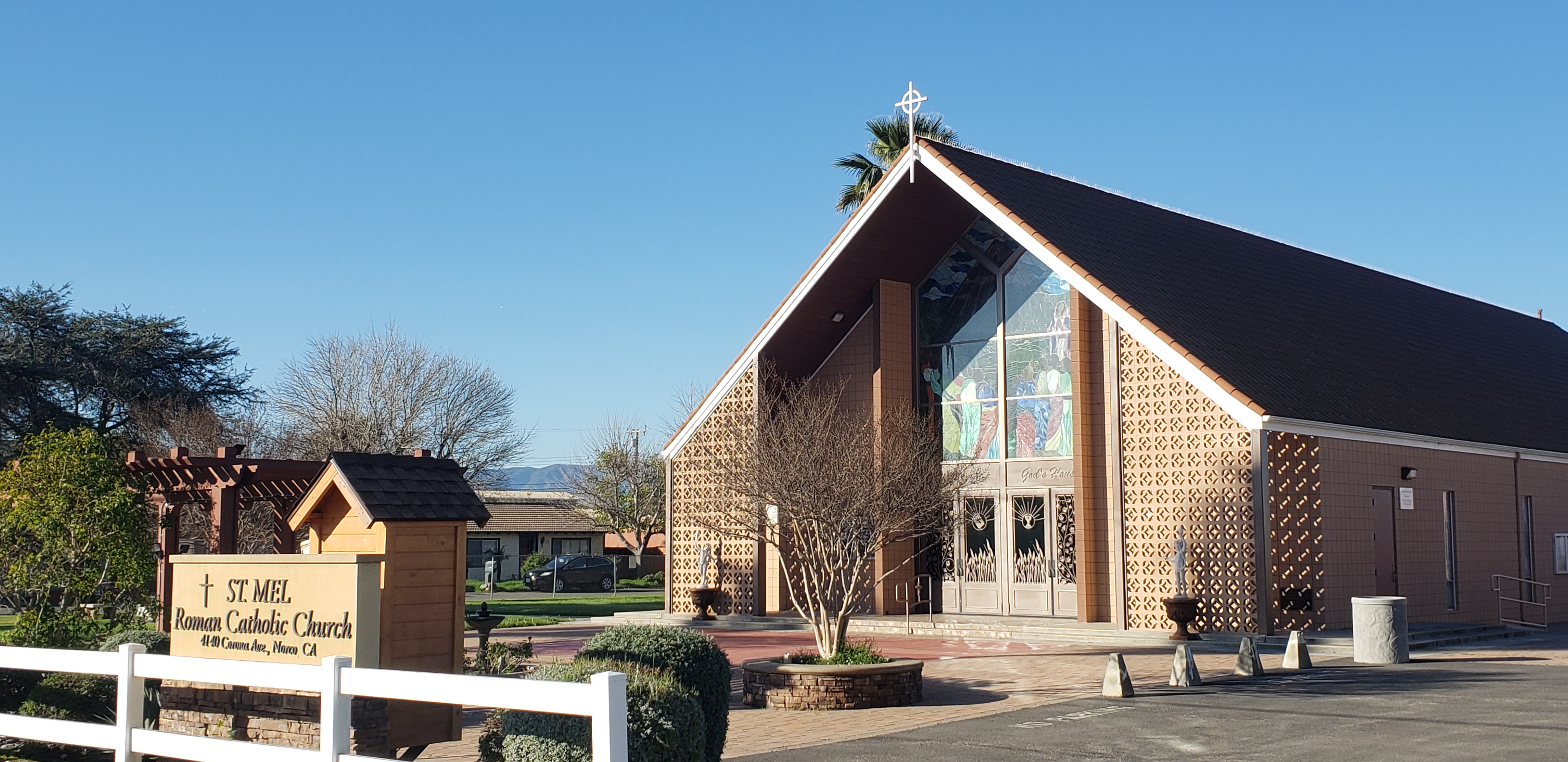 The new church building, seating 750, was dedicated on May 5, 1968, and 10 years later, St. Mel became part of the newly formed Diocese of San Barnardino. The Parish is served by two members of the Order of St. Augustine. Fr. Declan Fogarty O.S.A. ADM. and Fr. Patrick Crilly O.S.A.